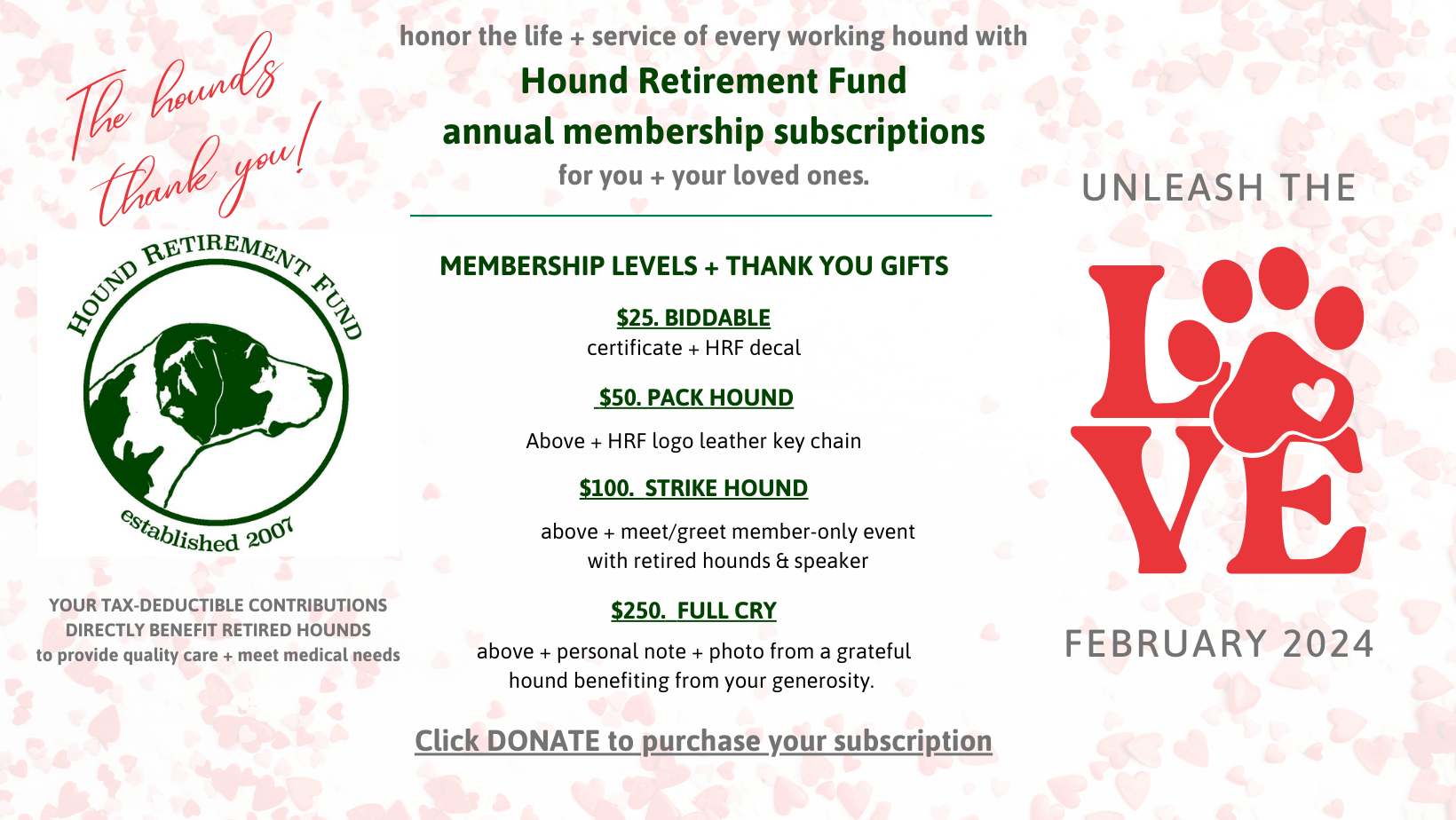 “Unleash the LOve” to honor the life + service of every working hound with HRF. Save the date Feb. 17/18, 2024